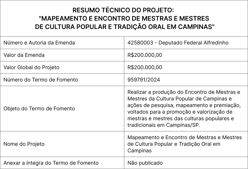A cidade de Campinas, ao aderir ao Sistema Nacional de Cultura em 2013 e instituir a Lei Municipal nº 14.701/13, deu início ao Programa Municipal de Patrimônio Imaterial, destacando a importância de salvaguardar as manifestações culturais locais. Contudo, a ausência de informações sistematizadas e indicadores culturais evidenciou a necessidade de ações específicas para localizar e engajar os mestres e mestras de tradição oral no município. Essa lacuna, também observada em outras localidades, motivou o desenvolvimento deste projeto.